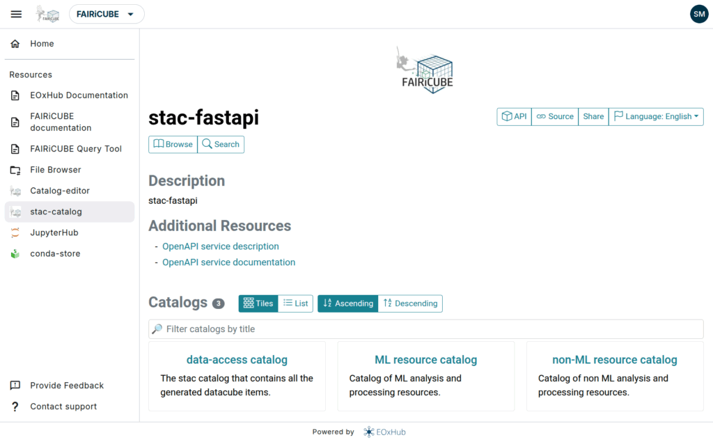 Alongside the workspace upgrade, the FAIRiCUBE Catalog has also migrated to version 2. The catalog, available at catalog.fairicube.hub-otc-sc.eox.at, is based on the SpatioTemporal Asset Catalog (STAC) specification.